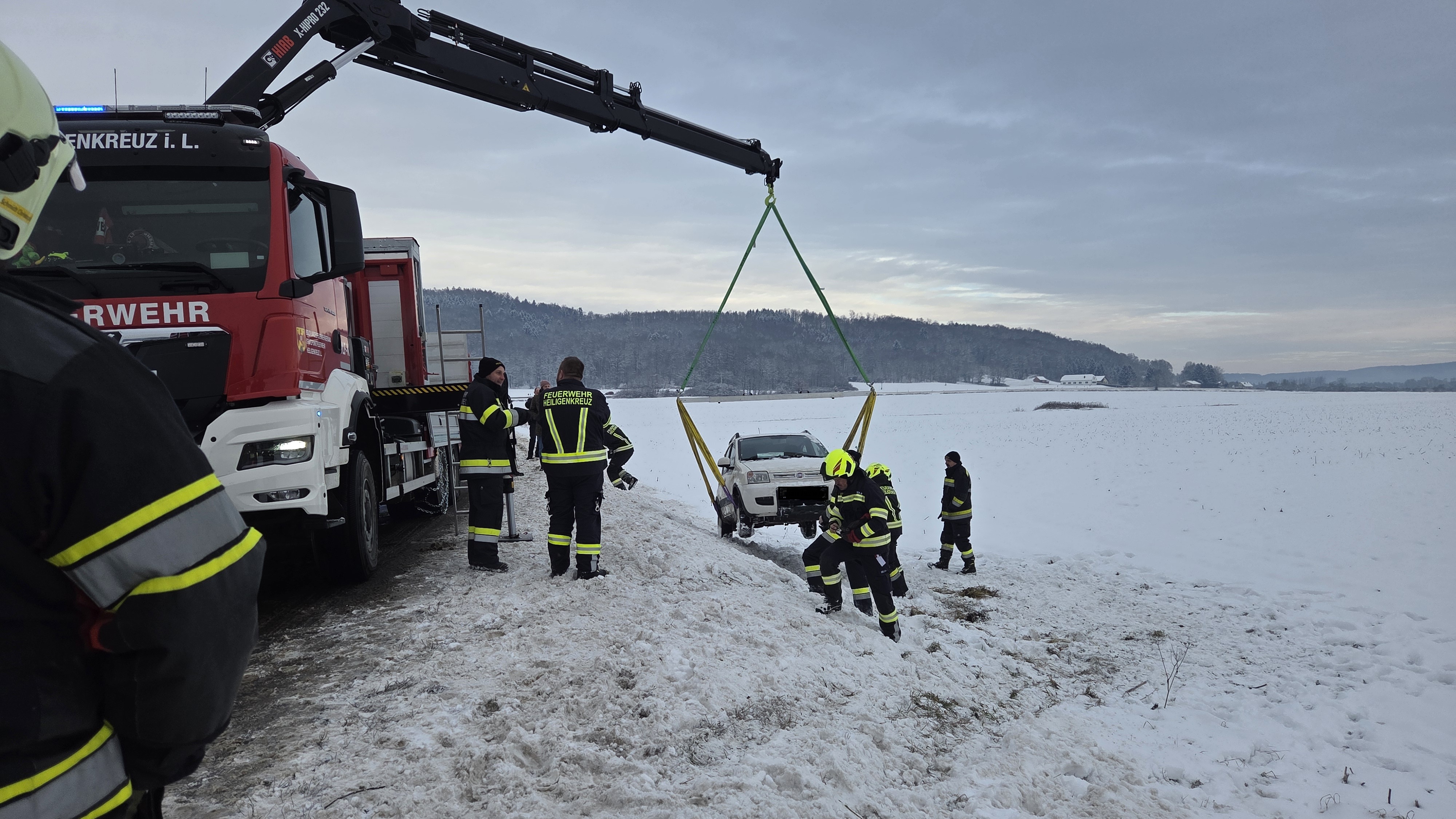 Am 07.0126 um 08:57 wurde die Feuerwehr Mogersdorf-Ort zusammen mit der Feuerwehr Heiligenkreuz/L. zu einem Verkehrsunfall mit eingeklemmter Person alarmiert. Eine Lenkerin aus Graz-Umgebung kam mit ihrem Fahrzeug aus bislang unbekannter Ursache auf der L 116 zwischen Mogersdorf und Heiligenkreuz von der Straße ab und blieb seitlich auf der Fahrerseite in einem Acker liegen. Die im Fahrzeug befindliche Person war somit eingeschlossen. Angehörige des Bundesheeres, die in einem Militärkonvoi unterwegs waren, waren als Ersthelfer vor Ort, leisteten umgehend Erste Hilfe und konnten die Person noch vor Eintreffen der Feuerwehr aus dem Fahrzeug retten. Die Aufgaben der Feuerwehr waren schlussendlich der Aufbau des Brandschutzes sowie die Fahrzeugbergung. Die gerettete Person wurde vom Roten Kreuz und dem Notarzt erstversorgt und zur Beobachtung ins Krankenhaus gebracht. Während der Bergungsarbeiten war die L116 für ca. 30 min gesperrt. Im Einsatz standen: Feuerwehr Mogersdorf-Ort mit drei Fahrzeugen und 11 Mitgliedern, Feuerwehr Heiligenkreuz/L. mit 2 Fahrzeugen und 8 Mitgliedern, Polizei, Rotes Kreuz, Notarzt und Bundesheer