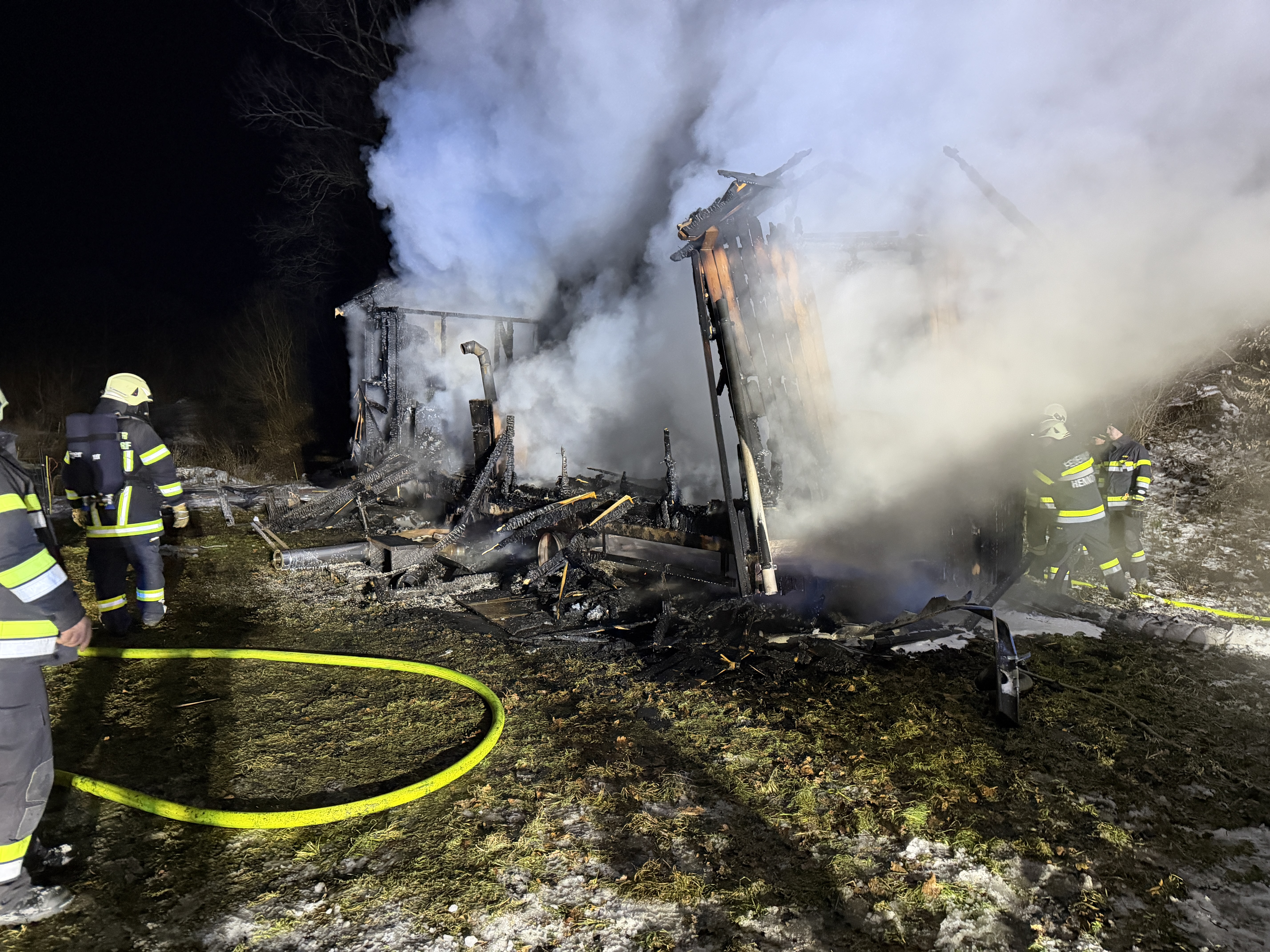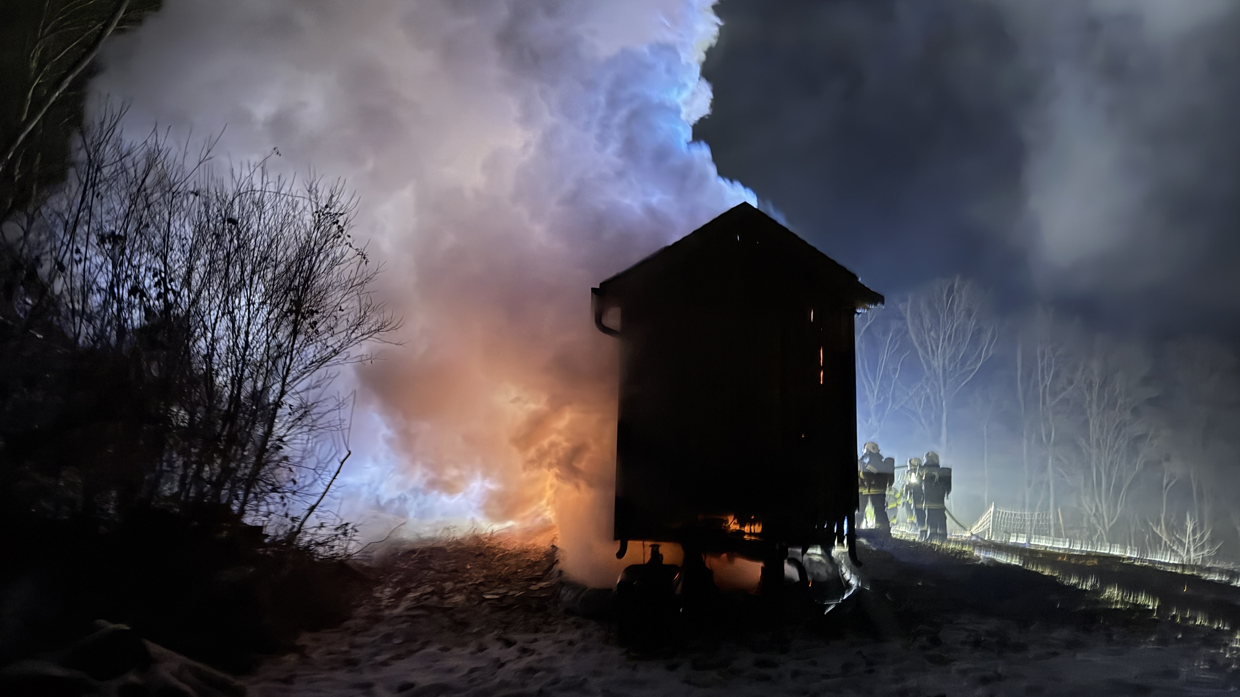 Ein Mobile Home stand in Vollbrand; klirrende Kälte und schwieriges Gelände forderten die Einsatzkräfte bis in die Nachtstunden.