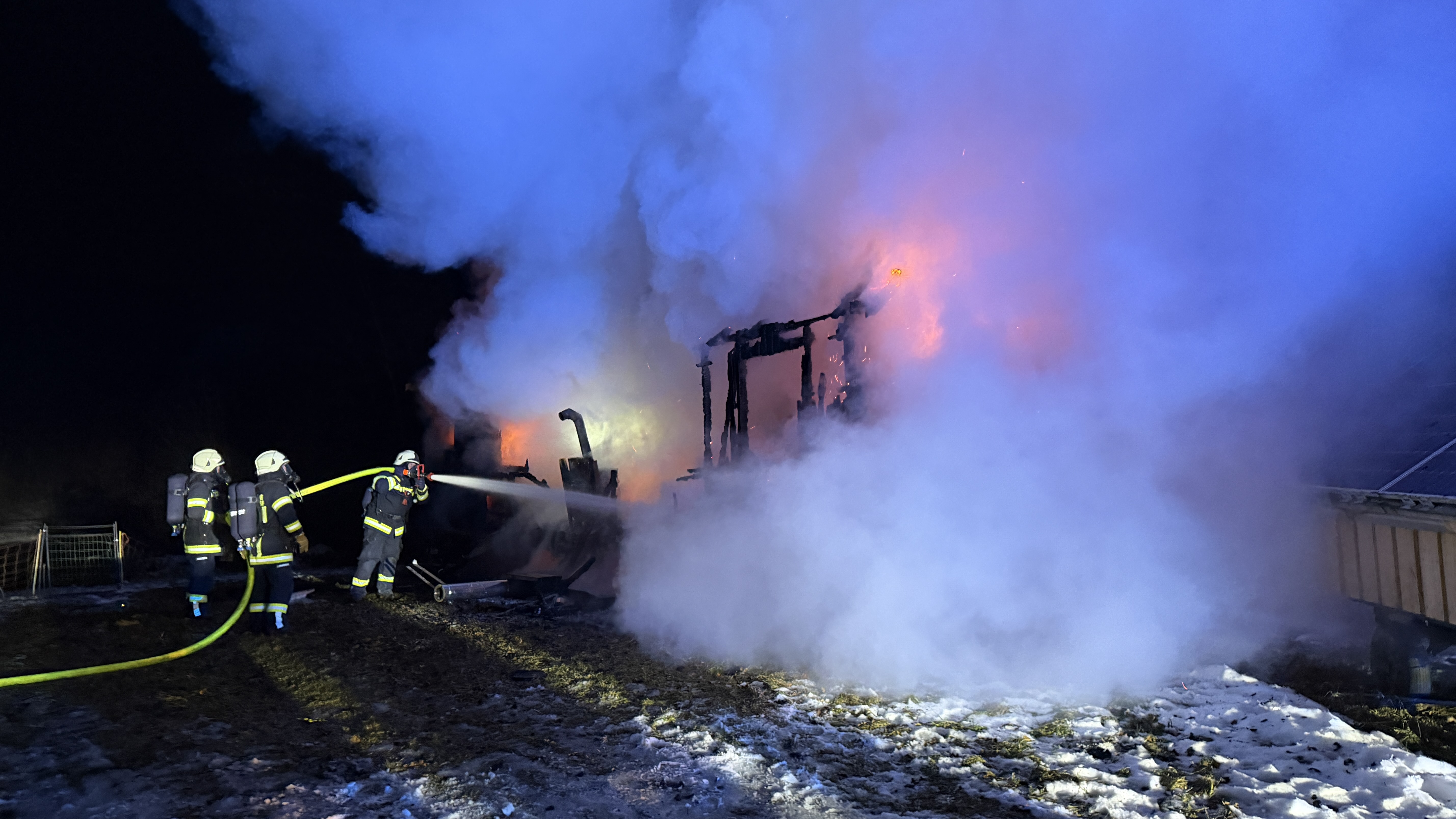 Vor Ort sorgten Temperaturen weit unter dem Gefrierpunkt für zusätzliche Hindernisse bei der Wasserversorgung. Um die Löschwasserversorgung sicherzustellen, musste ein nahegelegener Teich genutzt werden. Dieser war jedoch mit einer rund 20 Zentimeter dicken Eisschicht bedeckt, die von den Einsatzkräften händisch aufgehackt werden musste, um die Wasserversorgung sicherstellen zu können.