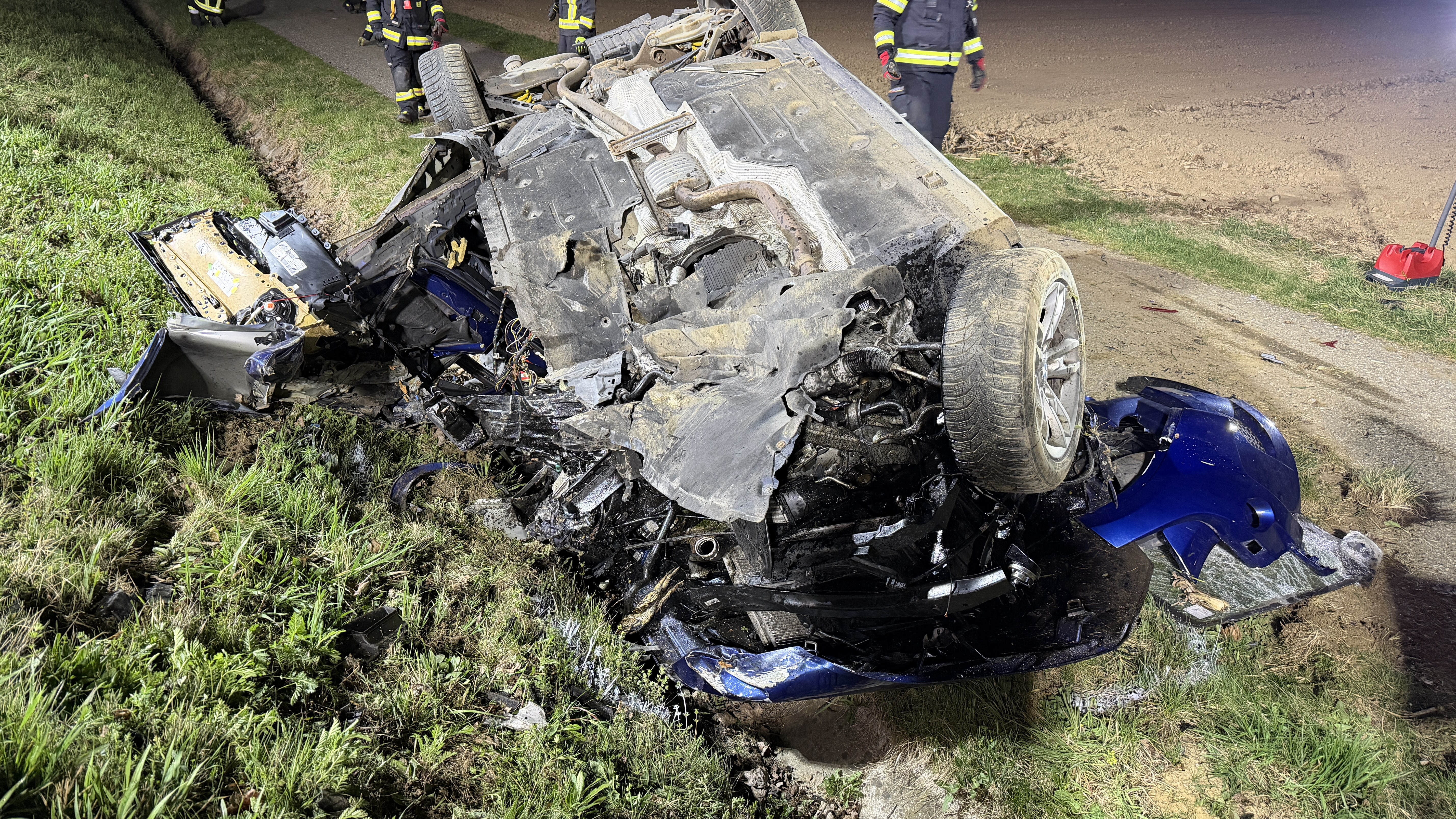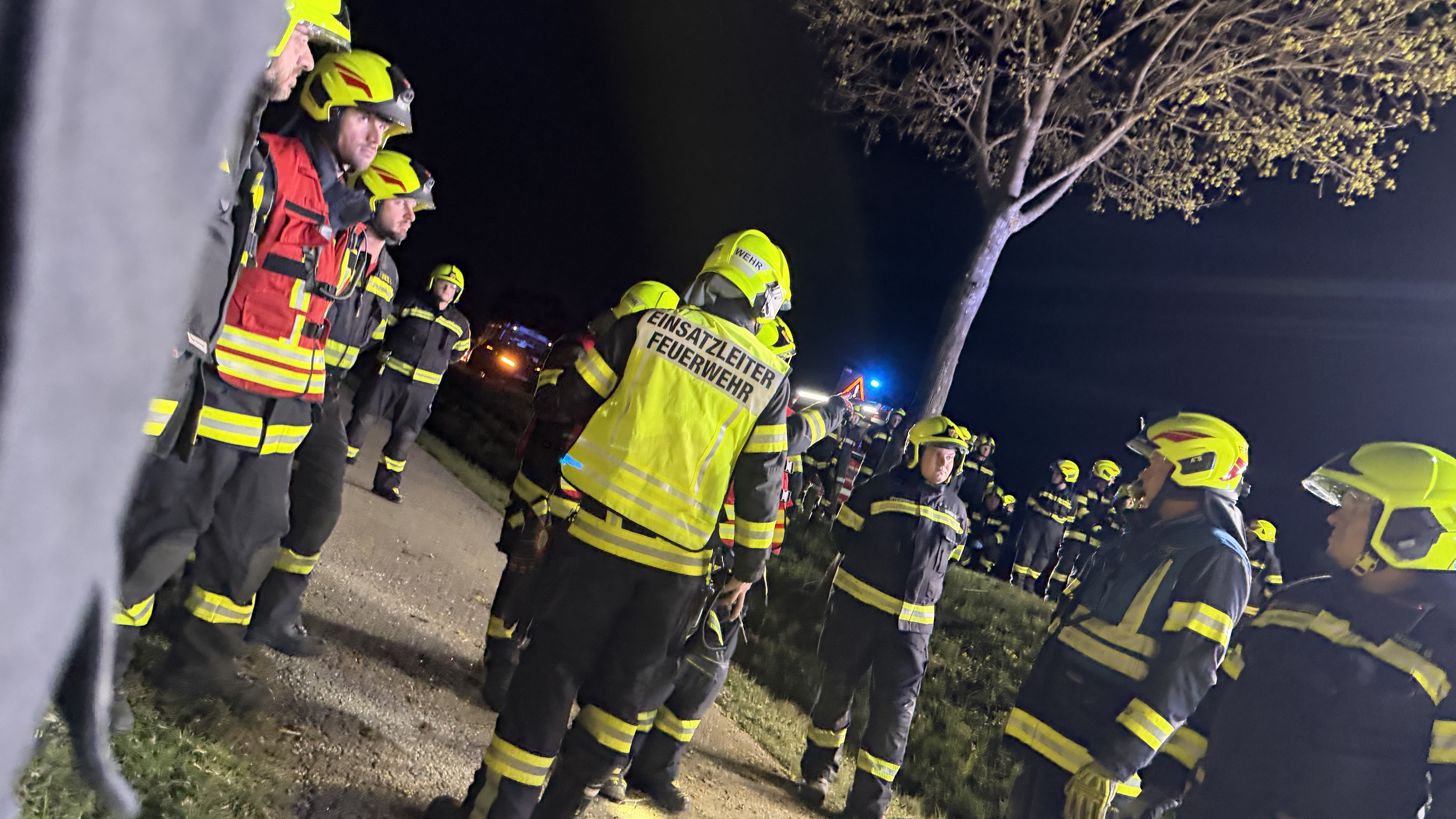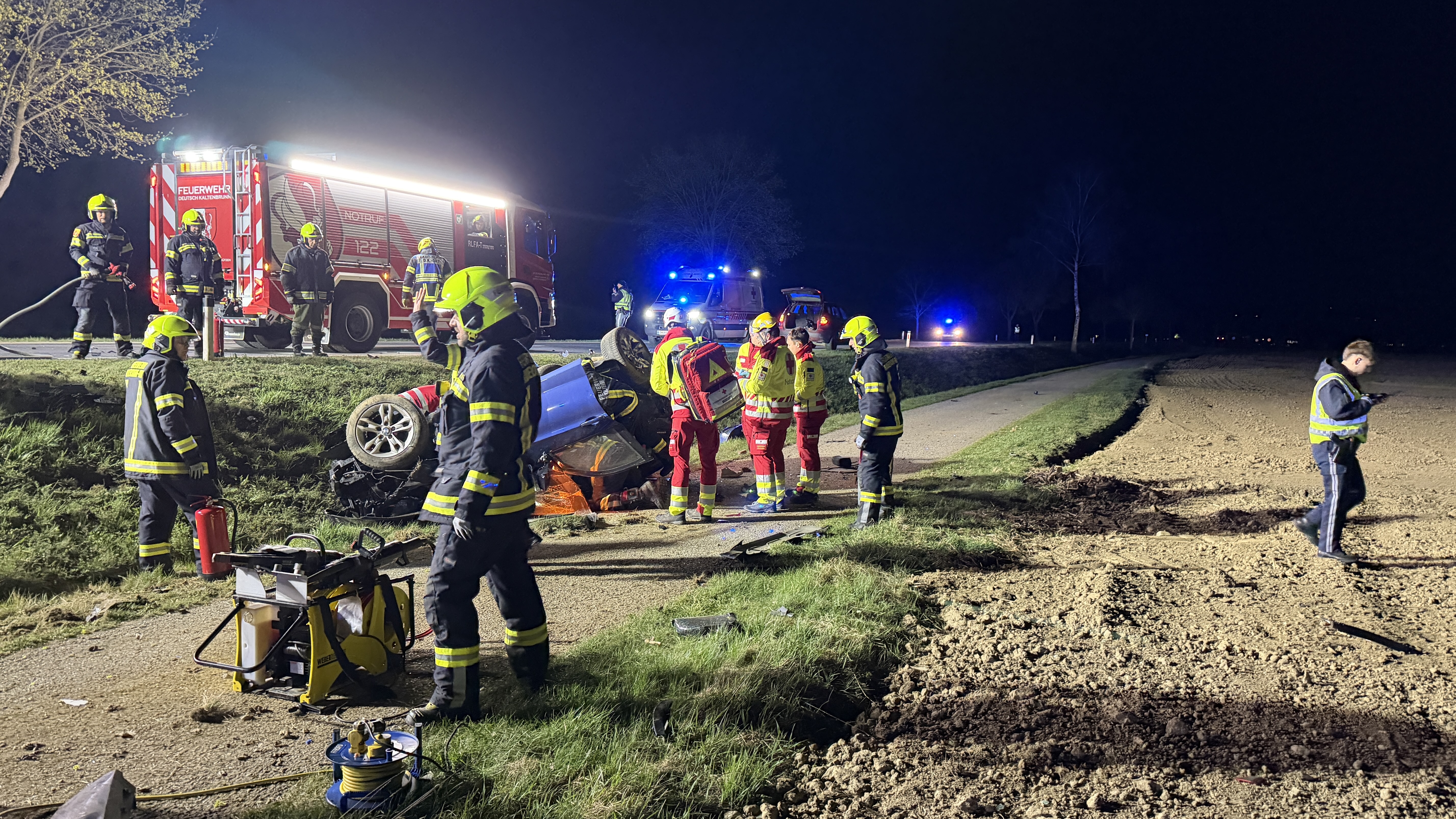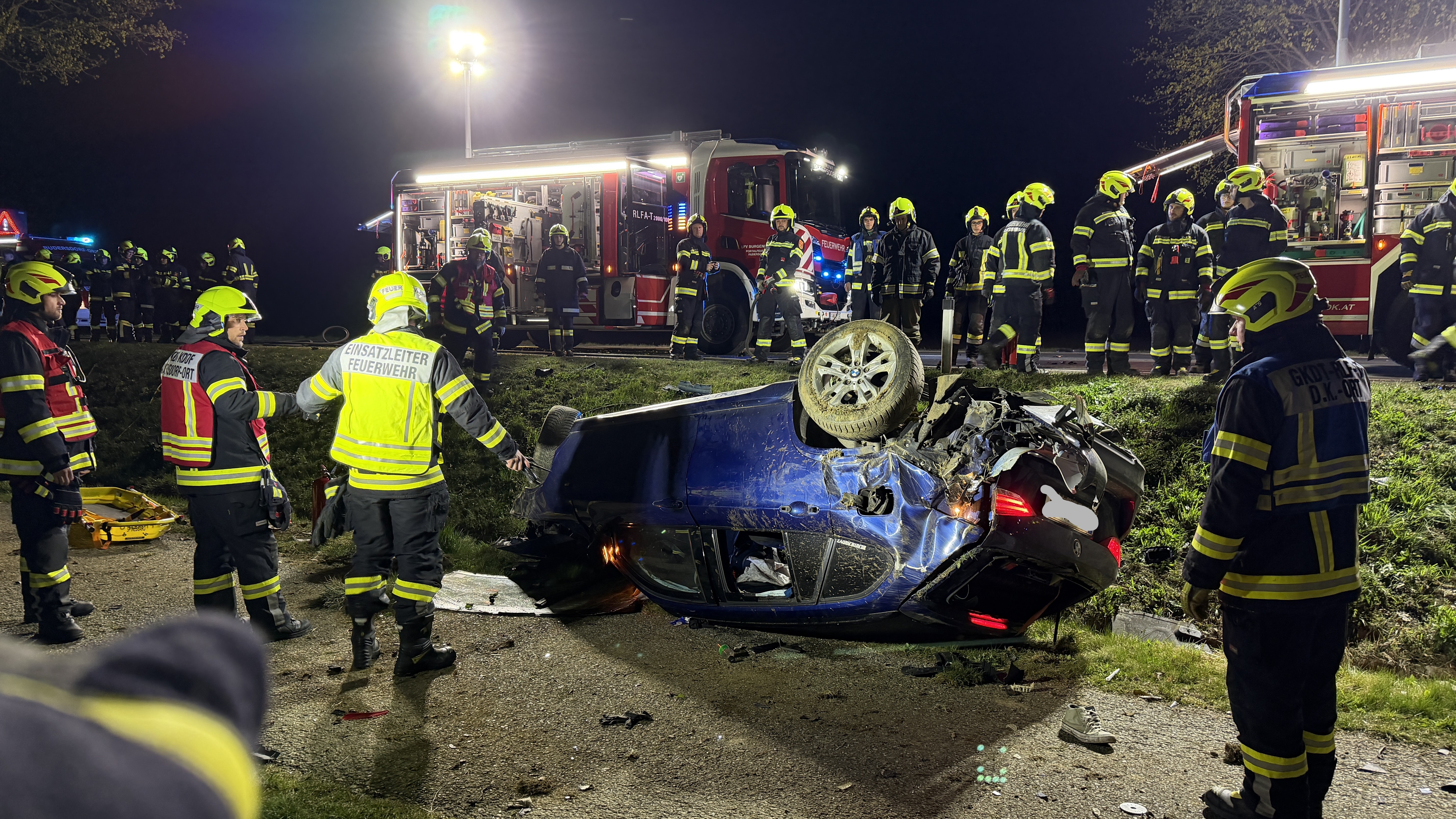 Gegen 20:15 Uhr kam ein Fahrzeuglenker aus bislang ungeklärter Ursache von der Fahrbahn ab. Der PKW prallte gegen einen Baum, überschlug sich und kam schließlich auf dem Dach zum Stillstand. Da die erste Meldung "Verkehrsunfall mit eingeklemmter Person" lautete, rückten insgesamt 55 Einsatzkräfte der drei Wehren mit 8 Fahrzeugen zur Unfallstelle aus.