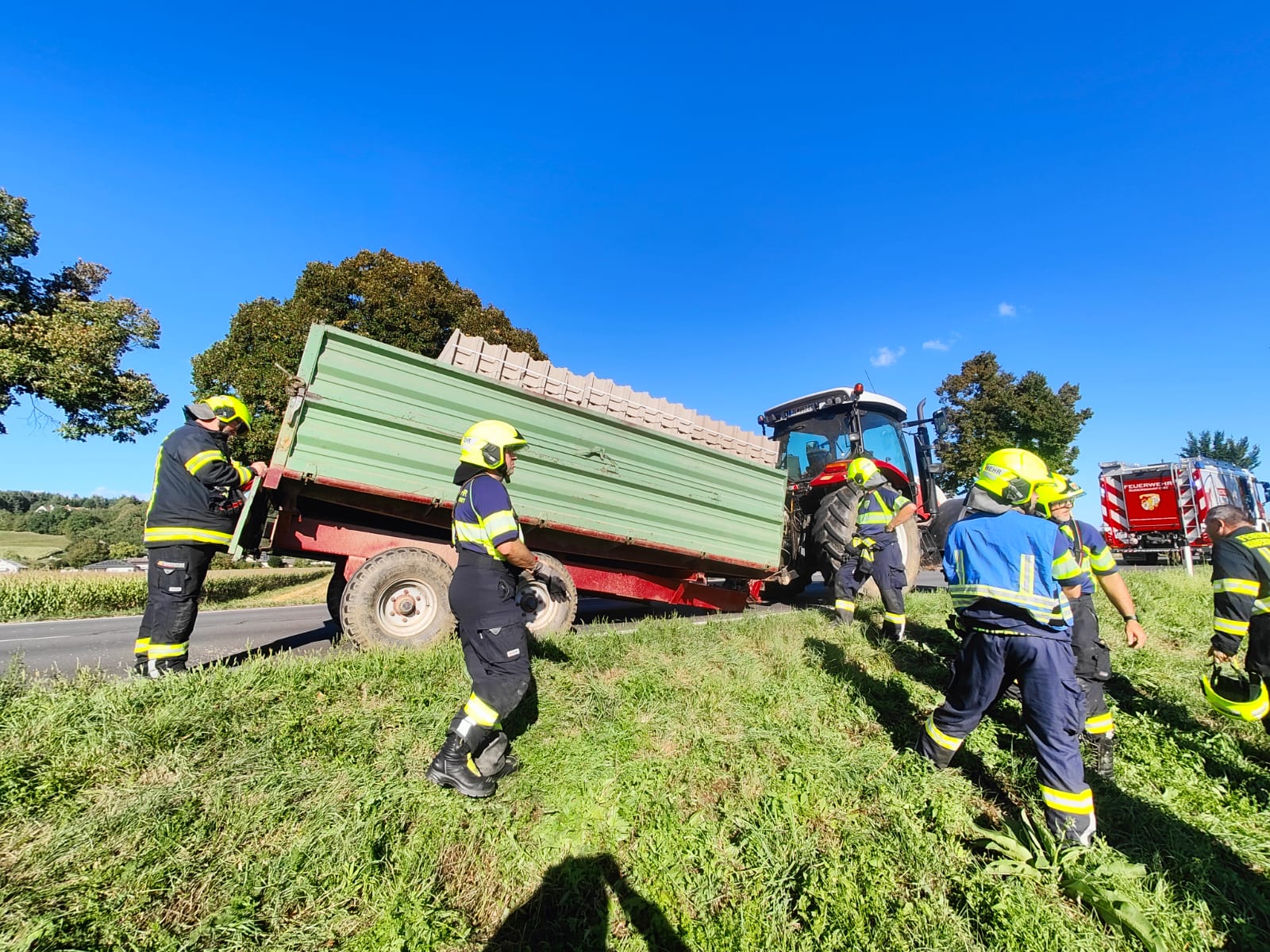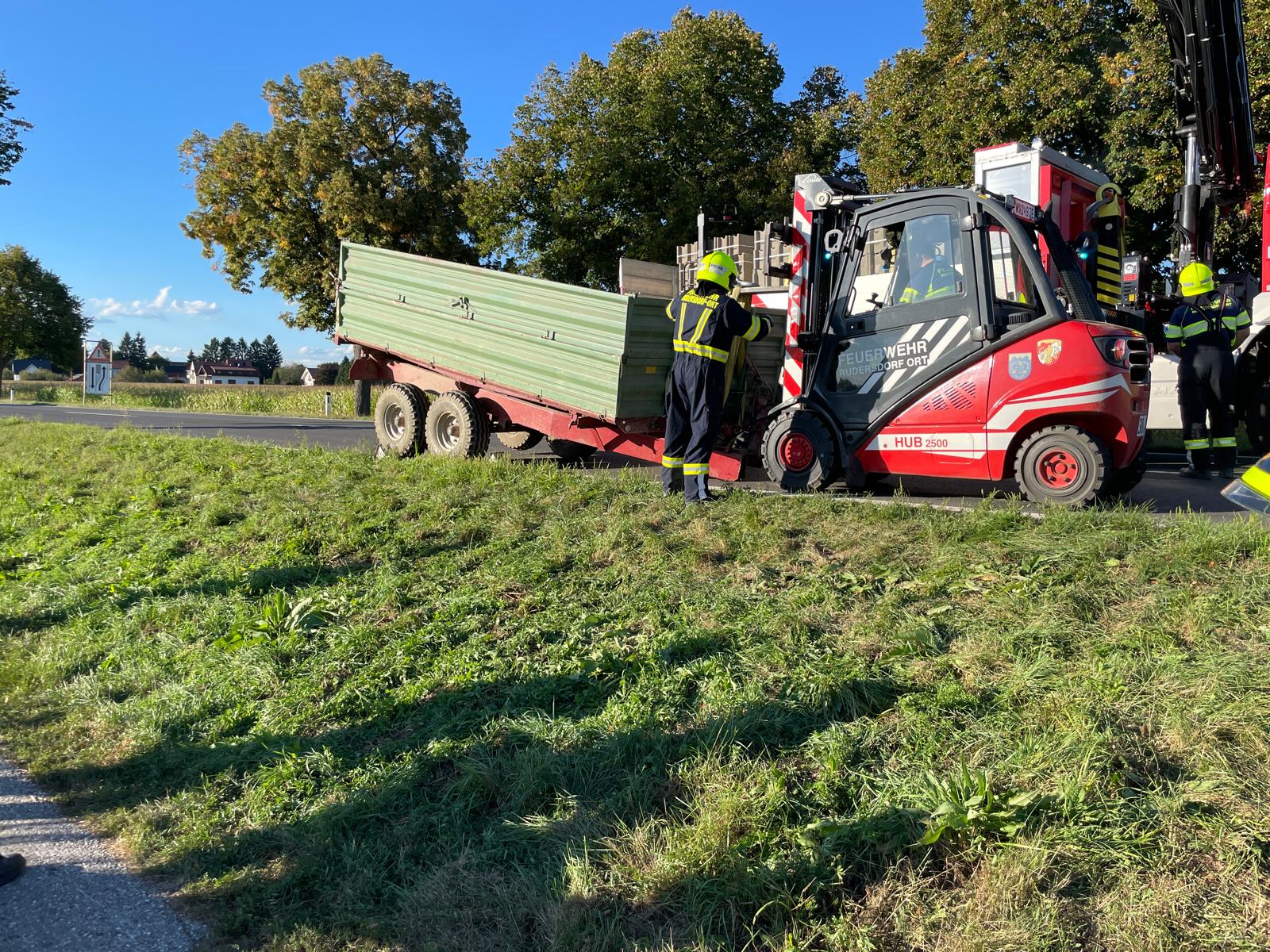 Aus unbekannter Ursache ist die Deichsel eines beladenen Anhängers gebrochen. Das Traktor-Anhängergespann konnte seine Fahrt nicht mehr fortsetzen und blockierte die Fahrspur Richtung Ungarn der B65 im Feierabendverkehr.
