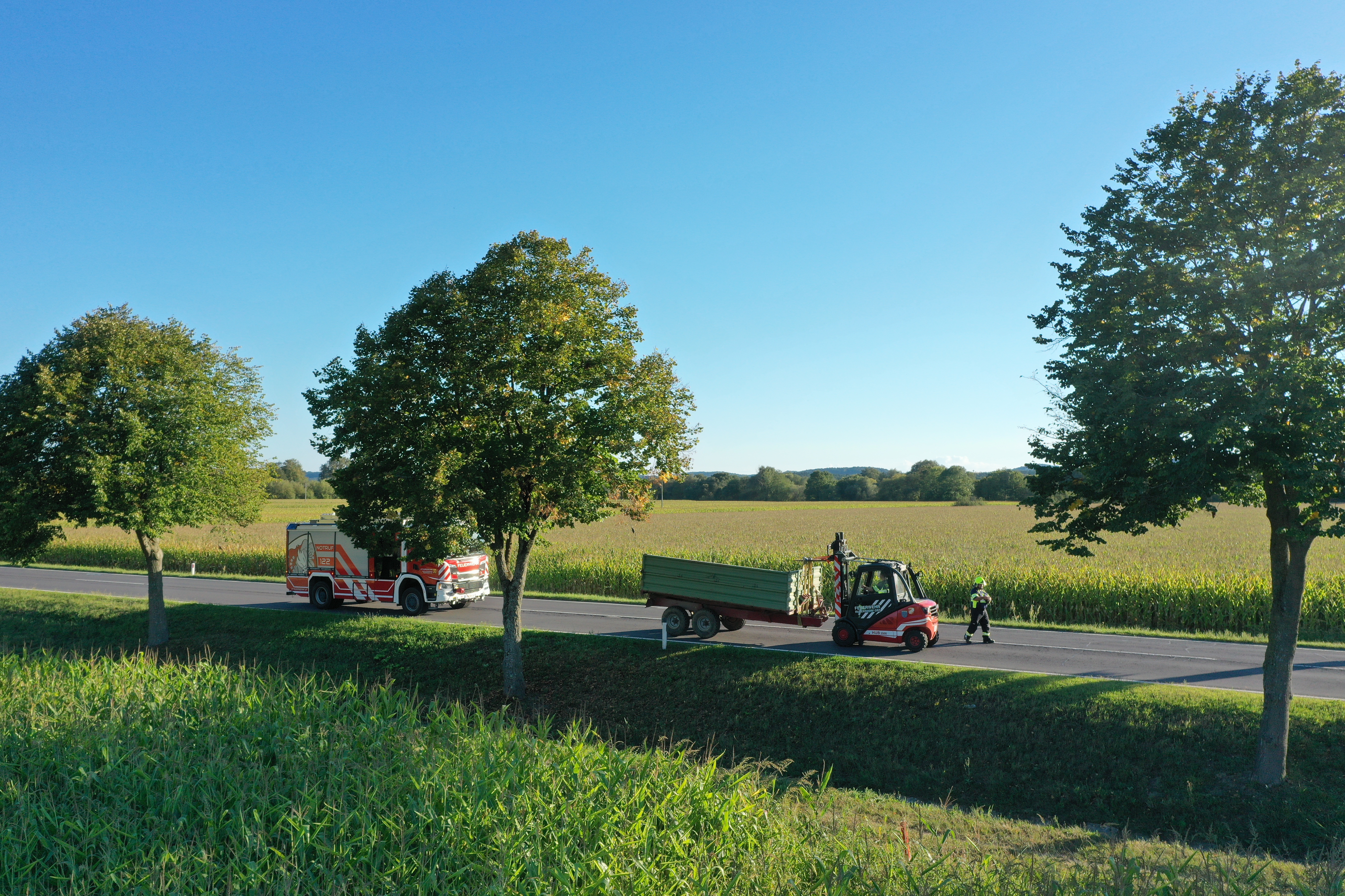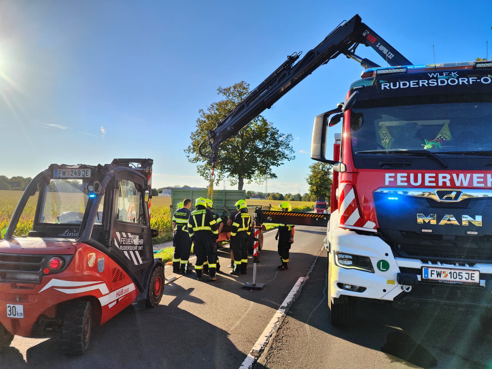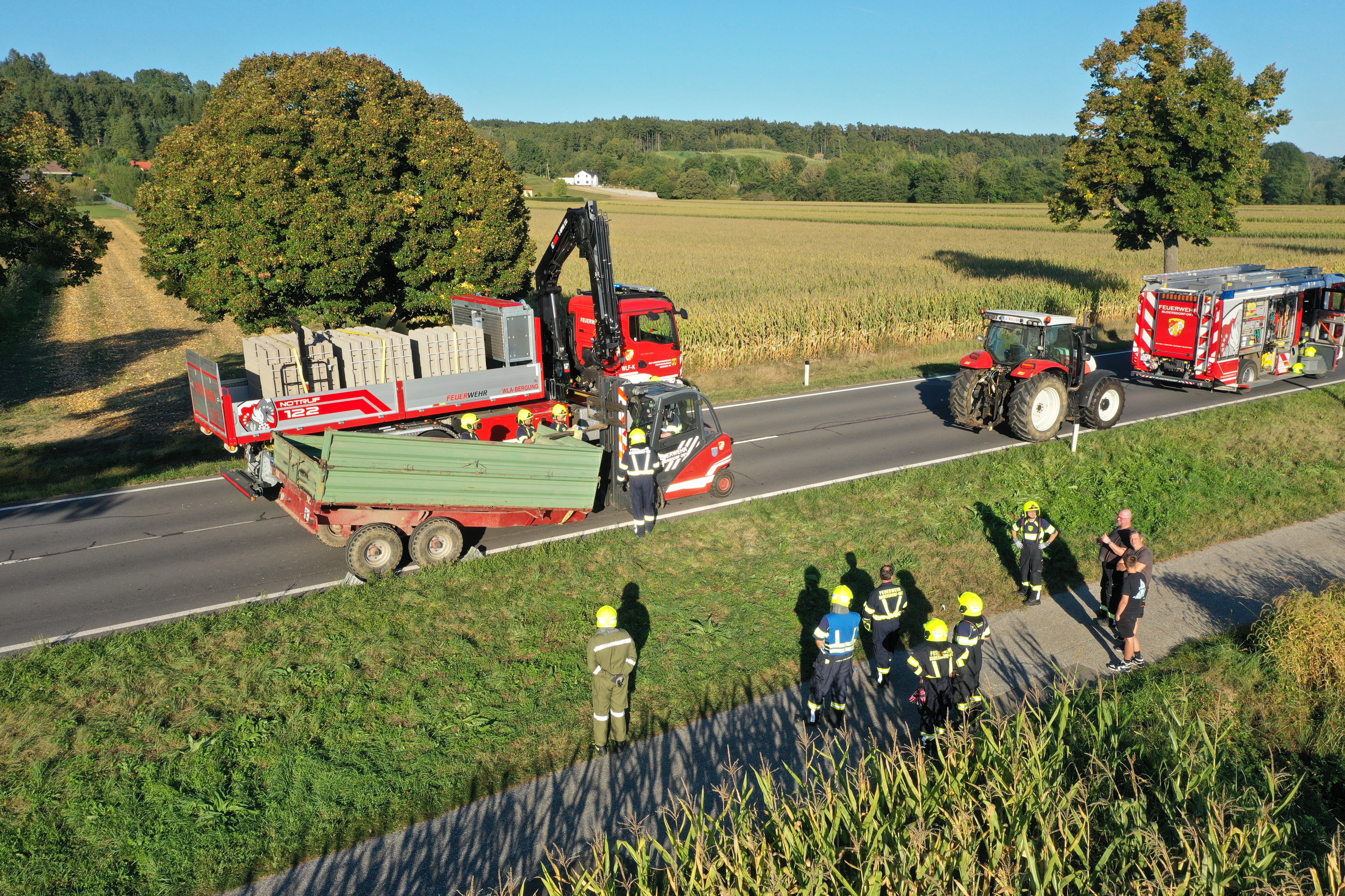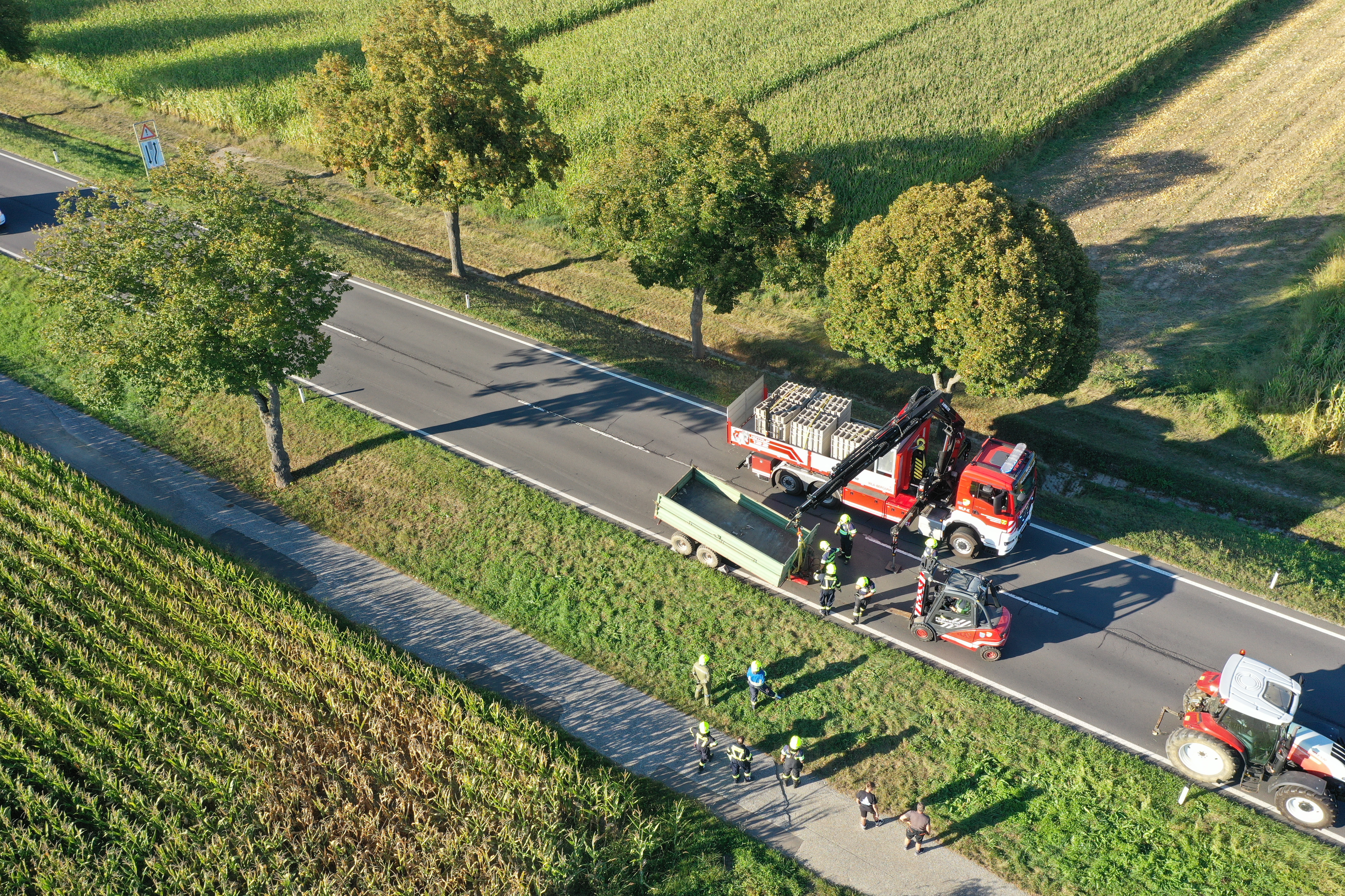Mit dem Kran des WLF (Wechselladerfahrzeug) wurde der Anhänger entladen und konnte mit Hilfe des Staplers der Feuerwehr von der Strasse entfernt und gesichert abgestellt werden.