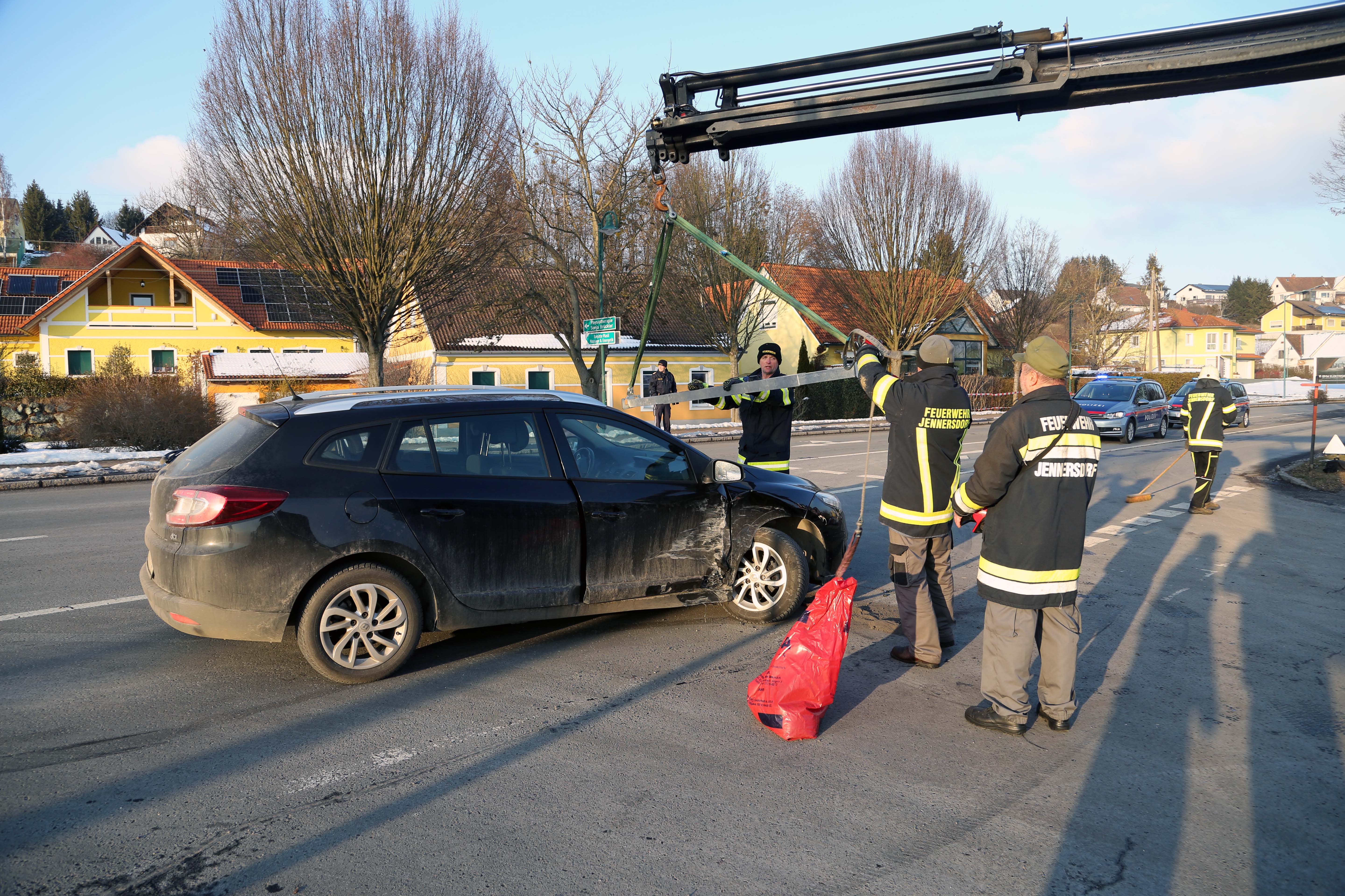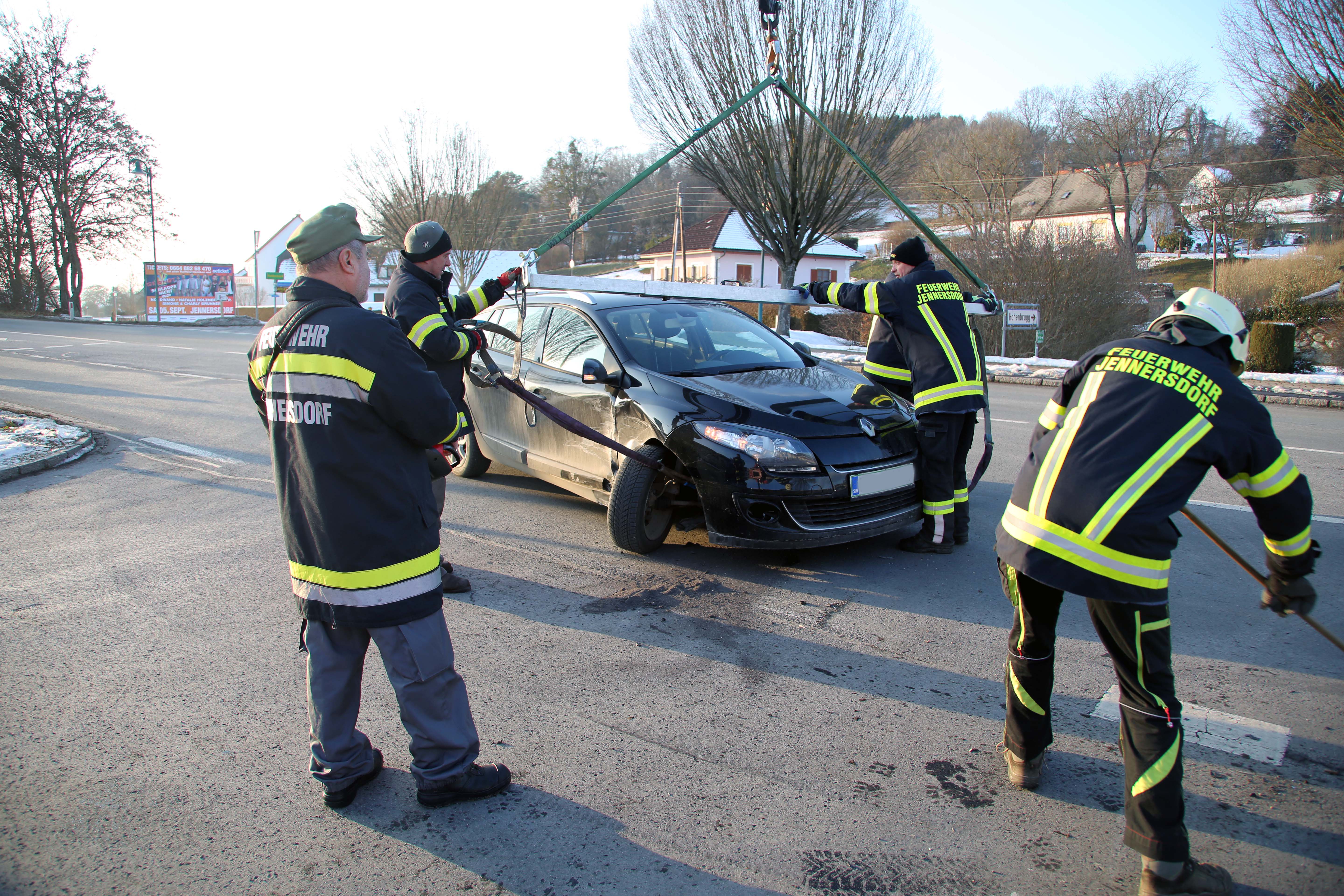 Montagnachmittag kam es in Jennersdorf auf der Kreuzung nahe eines großen Baumarktes zum seitlichen Zusammenstoß zweier PKW´s. Während ein Lenker aus Slowenien nach rechts in die Zufahrt zum Baumarkt einbog, wollte zur gleichen Zeit eine nachfahrende Lenkerin aus der Steiermark rechts daran vorbeifahren. Dadurch stießen die beiden Fahrzeuge seitlich zusammen, wobei der slowenische PKW fahruntüchtig wurde und danach Betriebsmittel austraten. Beide Lenker blieben bei dem Unfall unverletzt. Die FF Jennersdorf reinigte die Fahrbahn von der ausgetretenen Flüssigkeit und machte die Kreuzung für den Straßenverkehr auf der Bundesstraße 57 wieder frei.