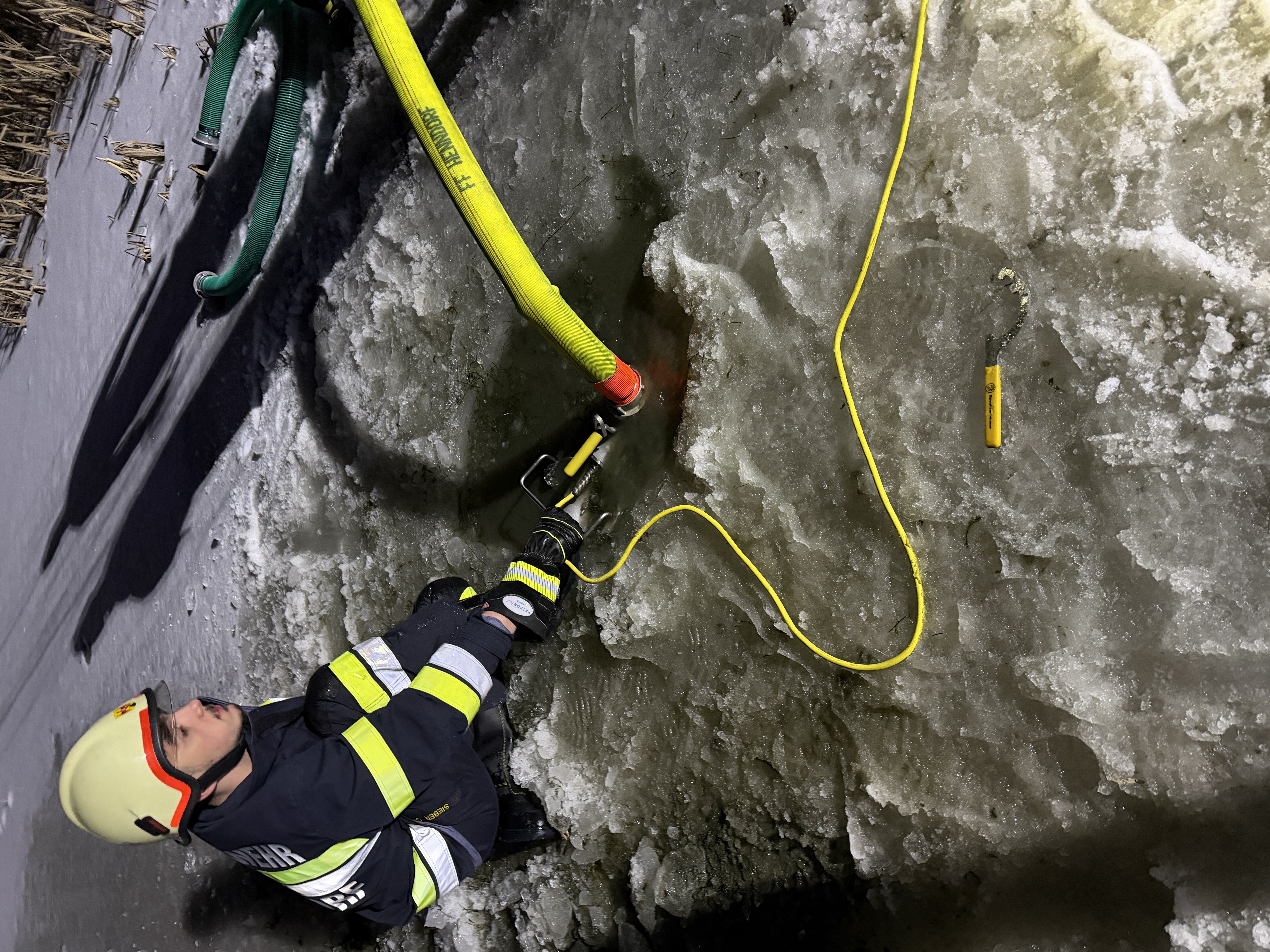 Vor Ort sorgten Temperaturen weit unter dem Gefrierpunkt für zusätzliche Hindernisse bei der Wasserversorgung. Um die Löschwasserversorgung sicherzustellen, musste ein nahegelegener Teich genutzt werden. Dieser war jedoch mit einer rund 20 Zentimeter dicken Eisschicht bedeckt, die von den Einsatzkräften händisch aufgehackt werden musste, um die Wasserversorgung sicherstellen zu können.