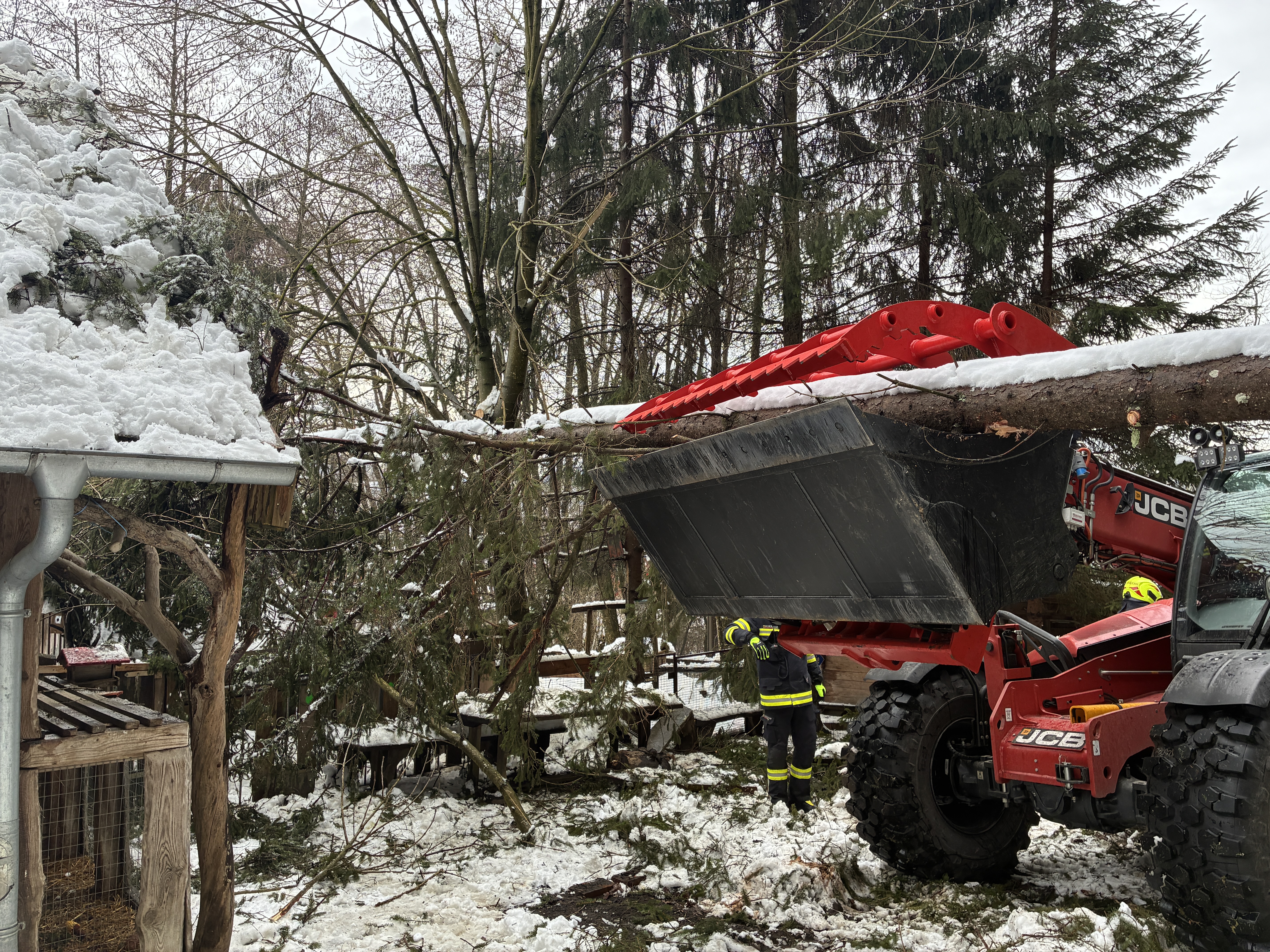 Parallel dazu kamen Teleskoplader der Feuerwehren Leithaprodersdorf und Oberpullendorf sowie des Landesfeuerwehrkommandos zum Einsatz, um beschädigte Stromleitungen zugänglich zu machen, schwere Schneelasten zu entfernen und Verkehrswege freizuräumen-